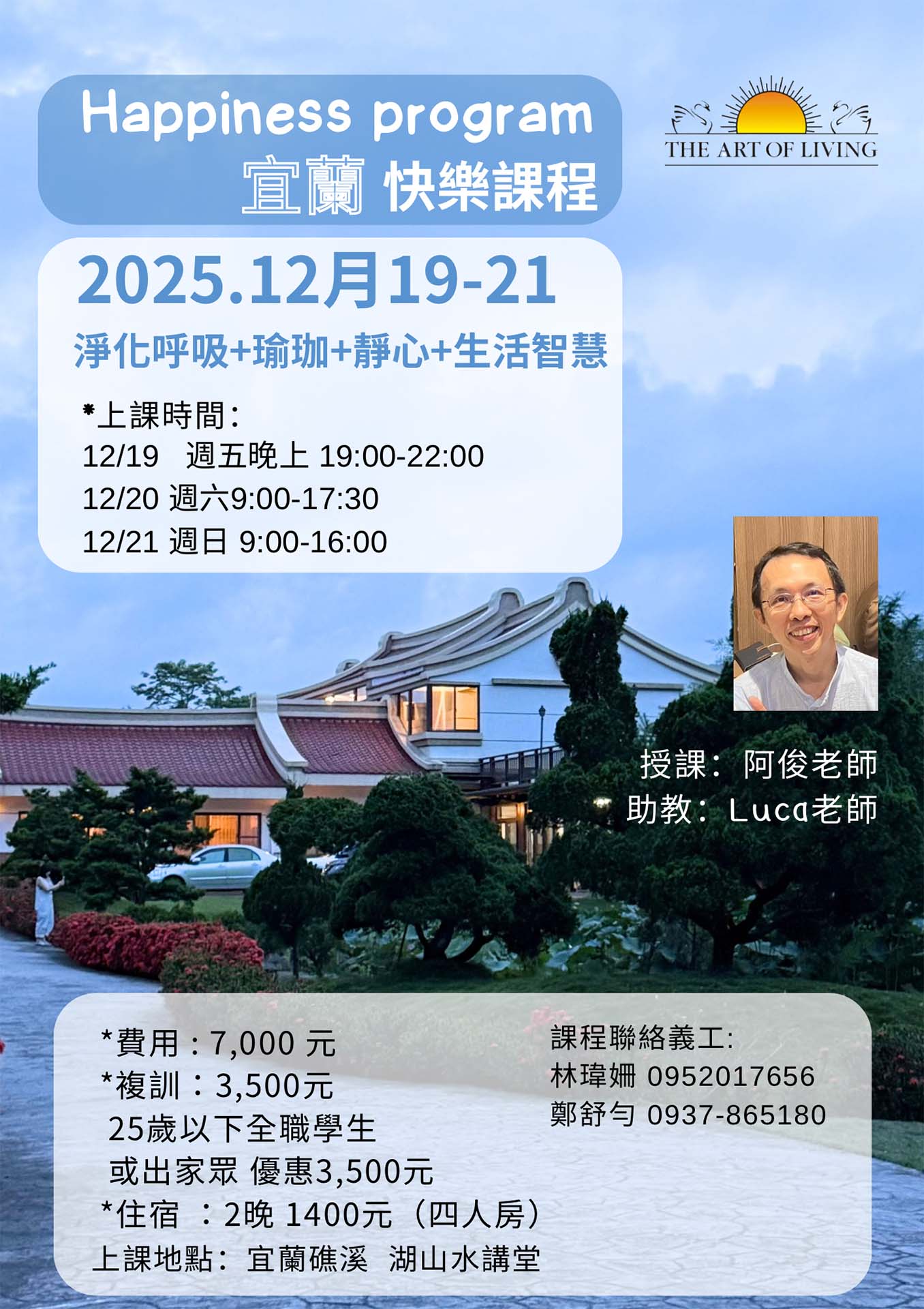 特價 上一項商品 下一項商品 快樂課程@宜蘭礁溪 12/19-21 指導者|阿俊老師 / 楊惠華 Luca 日 期|12/19(五)~12/21(日) 時 間|五19:00-22:00;六9:00-17:30;日9:00-16:00 NT$1,750 – NT$7,000價格範圍:NT$1,750 到 NT$7,000 新訓複訓 請選取一個選項新訓複訓 身份類別 請選取一個選項一般大眾18-25歲全職學生 / 出家眾清除 快樂課程@宜蘭礁溪 12/19-21 數量 加入購物車 貨號: 20251219-21-SKY-阿俊-楊惠華 分類: 初階課程, 快樂課程, 淨化呼吸 標籤: 12月, 宜蘭 描述 額外資訊 描述 宜蘭 快樂課程 - 淨化呼吸・瑜珈・生活智慧・靜心 - 🧘♀️課程指導:侯園俊 / 楊惠華LUCA📅課程時間:2025/12/19(五)~21(日)週五 19:00-22:00週六 09:00-17:30週日 09:00-16:00📍課程地點:宜蘭礁溪 湖山水會館 講堂(宜蘭縣礁溪鄉漳福路186號) 快樂課程@宜蘭礁溪 12/19-21 💰課程費用:7,000元:新生(一般大眾)3,500元:(新生)25歲以下全職學生/出家眾、(複訓)一般大眾1,750元:(複訓)25歲以下全職學生/出家眾🏘️住宿費用:如需住宿,費用另計(四人房兩晚)共計1400元請另行使用 Line Pay 或於 現場支付💬課程諮詢:楊惠華 0939-8949-46林瑋姍 0952-017-656鄭舒勻 0937-865-180 ⚠️報名注意事項:🔸請勿用同一個email帳號重複報名相同課程🔸如欲幫他人報名,請於結帳表單填寫對方的姓名+對方的e-mail,由系統自動為其建立帳號、或是另行建立新帳號報名 瞭解更多 淨化呼吸的好處 額外資訊 新訓複訓 新訓, 複訓 身份類別 一般大眾, 18-25歲全職學生 / 出家眾 Opens in a new window Share on Facebook Opens in a new window Mail This Product 相關商品 快速檢視 初階課程, 自然三摩地心法, 靜心 特價 快速檢視 自然三摩地靜心@線上 11/28-30選擇規格 此產品有多種款式。 可在產品頁面選擇選項 快速檢視 初階課程, 快樂課程, 淨化呼吸 特價 快速檢視 快樂課程@台中 11/21-23選擇規格 此產品有多種款式。 可在產品頁面選擇選項 快速檢視 初階課程, 快樂課程, 淨化呼吸 特價 快速檢視 快樂課程@桃園龍潭 12/12-14選擇規格 此產品有多種款式。 可在產品頁面選擇選項 快速檢視 初階課程, 快樂課程, 淨化呼吸 特價 快速檢視 快樂課程@台中 12/19-21選擇規格 此產品有多種款式。 可在產品頁面選擇選項
