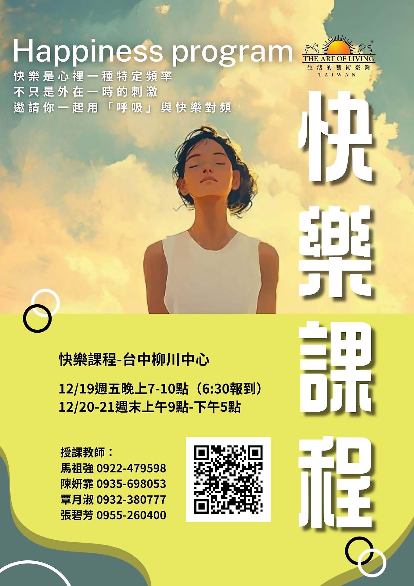 特價 上一項商品 下一項商品 快樂課程@台中 12/19-21 指導者|馬祖強 / 陳妍霏 / 覃月淑 / 張碧芳 日 期|12/19(五)~21(日) 時 間|週五19:00-22:00;六日09:00-17:00 NT$1,750 – NT$7,000價格範圍:NT$1,750 到 NT$7,000 新訓複訓 請選取一個選項新訓複訓 身份類別 請選取一個選項一般大眾18-25歲全職學生 / 出家眾清除 快樂課程@台中 12/19-21 數量 加入購物車 貨號: 20251219-21-SKY-馬祖強-陳妍霏-覃月淑-張碧芳 分類: 初階課程, 快樂課程, 淨化呼吸 標籤: 12月, 台中 描述 額外資訊 描述 快樂是心裡一種特定頻率不只是外在一時的刺激邀請你一起用「呼吸」與快樂對頻 Happiness program 🧘♀️課程指導:馬祖強 / 陳妍霏 / 覃月淑 / 張碧芳📅課程時間:2025/12/19(五)~21(日)週五晚上 19:00-22:00六日白天 09:00-17:00📍課程地點:台中柳川中心(柳川西路三段) 快樂課程@台中 12/19-21 💰課程費用:7,000元:新生(一般大眾)3,500元:(新生)18-25歲全職學生/出家眾、(複訓)一般大眾1,750元:(複訓)18-25歲全職學生/出家眾💬課程諮詢:馬祖強 0922-479-598陳妍霏 0935-698-053覃月淑 0932-380-777張碧芳 0955-260-400 ⚠️報名注意事項:🔸請勿用同一個email帳號重複報名相同課程🔸如欲幫他人報名,請於結帳表單填寫對方的姓名+對方的e-mail,由系統自動為其建立帳號、或是另行建立新帳號報名 瞭解更多 淨化呼吸的好處 額外資訊 新訓複訓 新訓, 複訓 身份類別 一般大眾, 18-25歲全職學生 / 出家眾 Opens in a new window Share on Facebook Opens in a new window Mail This Product 相關商品 快速檢視 初階課程, 快樂課程, 淨化呼吸 特價 快速檢視 快樂課程@桃園龍潭 12/12-14選擇規格 此產品有多種款式。 可在產品頁面選擇選項 快速檢視 初階課程, 快樂課程, 淨化呼吸 特價 快速檢視 快樂課程@花蓮市 11/14-16選擇規格 此產品有多種款式。 可在產品頁面選擇選項 快速檢視 初階課程, 快樂課程, 淨化呼吸 特價 快速檢視 快樂課程@台北微風小棧 11/21-23選擇規格 此產品有多種款式。 可在產品頁面選擇選項 快速檢視 高級課程, 進階課程 特價 快速檢視 高級課程@嘉義大埔 12/26-28(住宿)選擇規格 此產品有多種款式。 可在產品頁面選擇選項