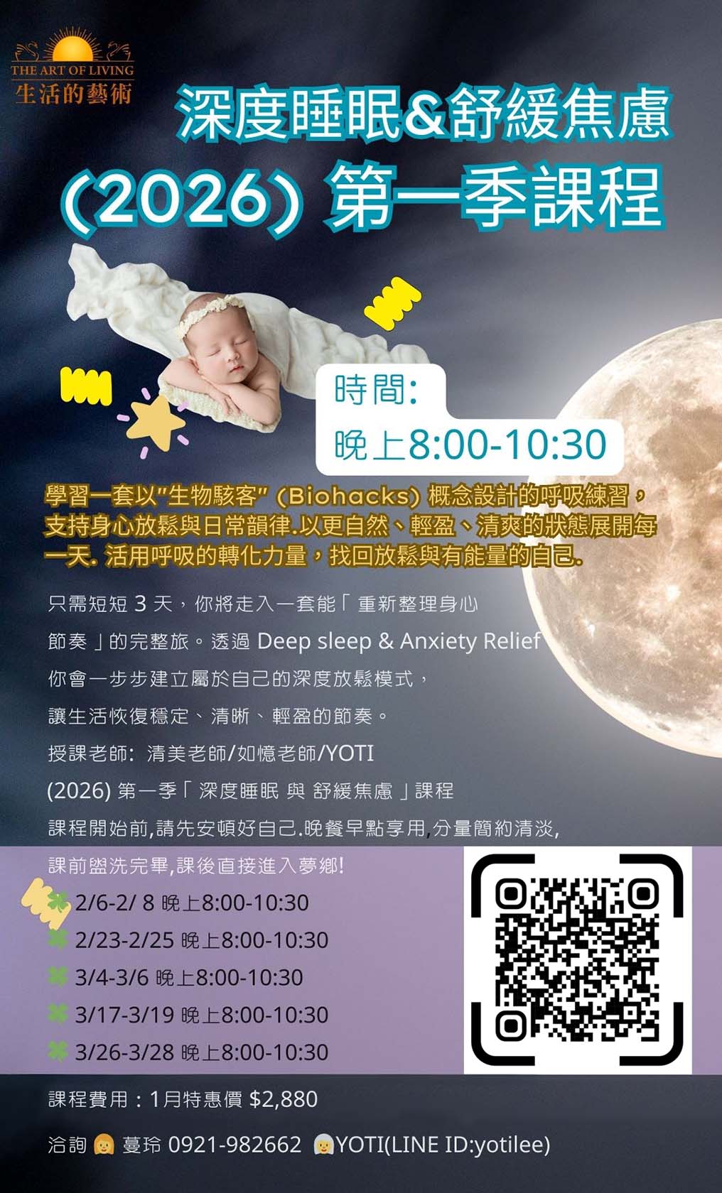 特價 上一項商品 下一項商品 2026第一季:深度睡眠與舒緩焦慮課程@線上5梯次擇一|清美.如憶.YOTI 老師 指導者|清美 / 如憶 / YOTI 日 期|2/6-8;2/23-25;3/4-6;3/17-19;3/26-28 時 間|五梯次擇一,每晚20:00-22:30(連續三天) NT$4,200 原始價格:NT$4,200。NT$2,880目前價格:NT$2,880。 優惠方案 請選取一個選項開春特惠清除 2026第一季:深度睡眠與舒緩焦慮課程@線上5梯次擇一|清美.如憶.YOTI 老師 數量 加入購物車 貨號: 20260206-0328-DSAR-清美-如憶-YOTI 分類: 初階課程, 深度睡眠與舒緩焦慮, 深層睡眠 標籤: 2月, 3月, 線上 描述 額外資訊 描述 { 五梯次擇一 } 2026第一季課程 只需短短3天,你將走入一套能「重新整理身心節奏」的完整旅程 透過Deep Sleep & Anxiety Relief,你會一步步建立屬於自己的深度放鬆模式,讓生活恢復穩定、清晰、輕盈的節奏!活化迷走神經,促進身心的安定感協助身體建立固定的睡眠節奏(Circadian Rhythm)提升白天的專注與思緒清晰度參與每日Q&A,由專業老師以科學化方式指導你練習 2026第一季:深度睡眠與舒緩焦慮課程@線上 🧘♀️課程指導:清美 / 如憶 / YOTI🕗課程時間:每晚 8:00-10:30(連續三天)📅課程日期(五梯次擇一)🔸2/06(五) – 2/08(日)🔸2/23(一) – 2/25(三)🔸3/04(三) – 3/06(五)🔸3/17(二) – 3/19(四)🔸3/26(五) – 3/28(日)🌐上課方式:線上ZOOM會議室💬課程諮詢:蔓玲 0921-982-662YOTI老師(LINE ID:yotilee) 📋 課程注意事項:🔌📱💻 上課前請先檢查網路、手機或電腦設備,確認順利連上 Zoom🍽️🥗 晚餐早點用,份量簡約清淡🚿🧼 上課前請先盥洗完畢🌙😴 課後直接進入夢鄉!💰課程費用:原價 $4,200元🌸2026開春限時特惠 $2,880元 ⚠️報名注意事項:🔓 免登入、免註冊:直接選課→加入購物車→結帳→綠界付款🚫 一個email代表一位報名者,請勿重複報名相同課程📝 幫他人報名,請先登出網站。另於結帳表填上對方的姓名/對方的Email,由系統為其建立帳號報名。 瞭解更多 深度睡眠與舒緩焦慮課程 額外資訊 優惠方案 開春特惠 Opens in a new window Share on Facebook Opens in a new window Mail This Product 相關商品 快速檢視 初階課程, 快樂課程, 淨化呼吸 特價 快速檢視 快樂課程@宜蘭礁溪 6/12-14|阿俊.Luca 老師選擇規格 此產品有多種款式。 可在產品頁面選擇選項 快速檢視 初階課程, 快樂課程, 淨化呼吸 特價 快速檢視 快樂課程@台北內湖 4/10-12|Leo.惠玲 老師選擇規格 此產品有多種款式。 可在產品頁面選擇選項 快速檢視 初階課程, 快樂課程, 淨化呼吸 特價 快速檢視 快樂課程@台北微風小棧 3/20-22|淑敏老師選擇規格 此產品有多種款式。 可在產品頁面選擇選項 快速檢視 初階課程, 快樂課程, 淨化呼吸 特價 快速檢視 清明連假-快樂課程@桃園 4/3-5|文玲.欣瑜.逸慧 老師選擇規格 此產品有多種款式。 可在產品頁面選擇選項
