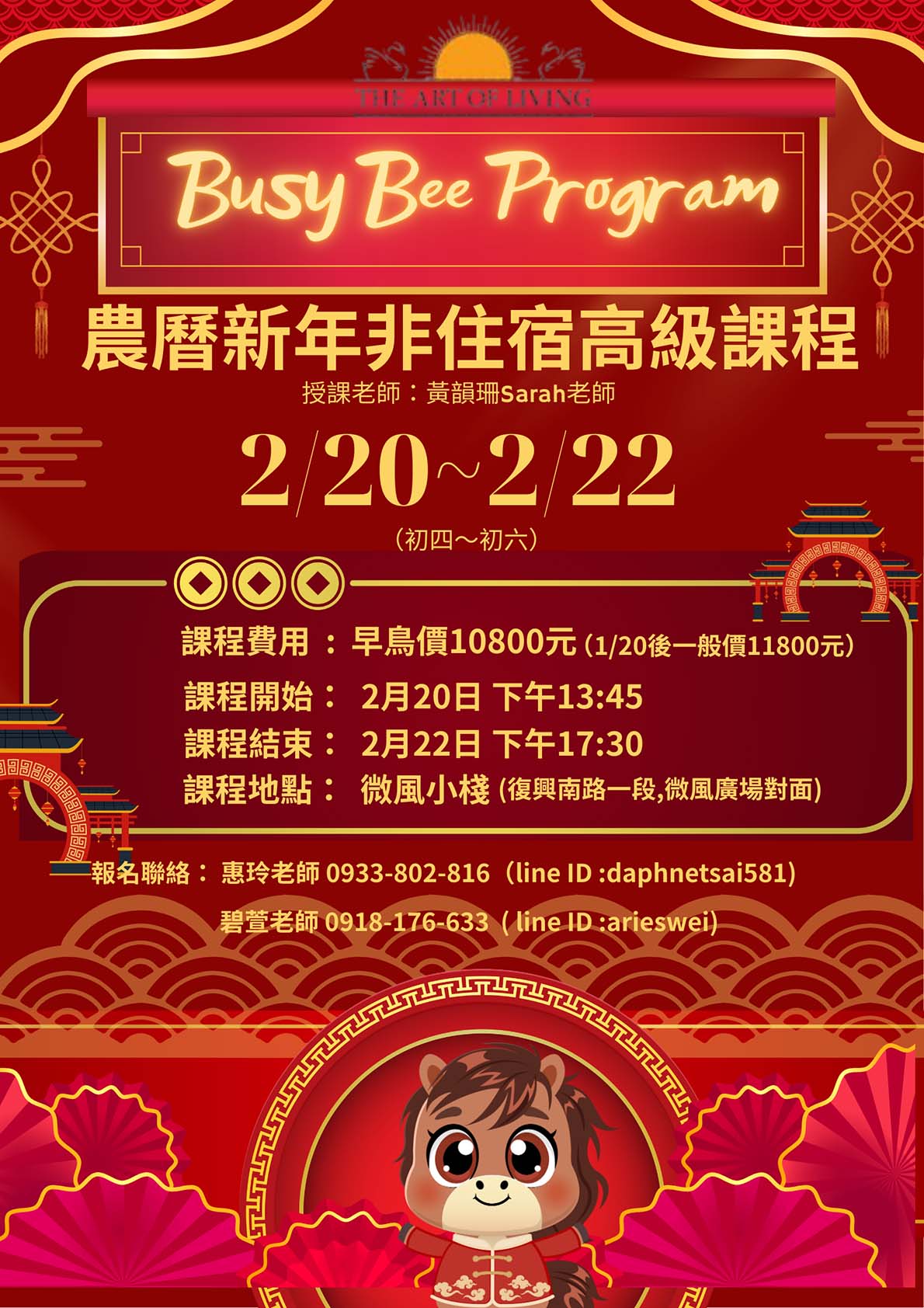 上一項商品 下一項商品 農曆新年高級課程@台北微風小棧 2/20-22(非住宿)|韻珊老師 指導者|黃韻珊 日 期|2/20(五)~2/22(日) 時 間|五13:45-20:45;六07:00-18:30;日07:00-17:30 NT$11,800 優惠方案 請選取一個選項早鳥價/每人原價/每人清除 農曆新年高級課程@台北微風小棧 2/20-22(非住宿)|韻珊老師 數量 加入購物車 貨號: 20260220-22-ADV-黃韻珊 分類: 高級課程, 進階課程 標籤: 2月, 台北 描述 額外資訊 描述 Busy Bee Program 農曆新年 高級課程 大年初四~初六 農曆新年高級課程@台北微風小棧 2/20-22 🧘♀️課程指導:黃韻珊📅課程時間:2026/2/20(五)~2/22(日)2/20 (五) 13:45 – 20:452/21 (六) 07:00 – 18:302/22 (日) 07:00 – 17:30📍課程地點:台北微風小棧台北市復興南路一段32號9F(復興微風百貨對面)💬課程諮詢:韻珊老師 Line ID:srisriyogataiwan惠玲老師 0933-802-816 Line ID :daphnetsai581碧萱老師 0918-176-633 LINE ID:arieswei 💰課程費用:(非住宿)🕊️早鳥優惠至1/20截止原價 $11,800元;早鳥價 $10,800 📚 報名課程:免登入 / 免註冊直接選課 → 加入購物車 → 結帳 → 綠界付款(新用戶系統將自動建立帳號)👤 查詢購買紀錄/我的課程:請使用帳號密碼或 Google 登入查看🚫 一位報名者一個email,請勿用同一個email重複報名相同課程✍️ 代他人報名,請先登出網站:另於結帳表填上對方姓名+對方的Email,由系統自動為其建立帳號 瞭解更多 高級課程 額外資訊 優惠方案 早鳥價/每人, 原價/每人 Opens in a new window Share on Facebook Opens in a new window Mail This Product 相關商品 快速檢視 高級課程, 進階課程 特價 快速檢視 高級課程@台北MAG教室 4/3-6(非住宿)|韻珊老師選擇規格 此產品有多種款式。 可在產品頁面選擇選項 快速檢視 初階課程, 快樂課程, 淨化呼吸 特價 快速檢視 快樂課程@台北微風小棧 3/10-12|Leo.惠玲 老師選擇規格 此產品有多種款式。 可在產品頁面選擇選項 快速檢視 兒童/青少年, 直覺課程 特價 快速檢視 JUNIOR(5-8歲) 新版直覺課程@台北Lakshmi教室 2/2-4|YOTI 老師選擇規格 此產品有多種款式。 可在產品頁面選擇選項 快速檢視 初階課程, 深度睡眠與舒緩焦慮, 深層睡眠 特價 快速檢視 深度睡眠與舒緩焦慮課程@線上 2/20-22|素琴 老師選擇規格 此產品有多種款式。 可在產品頁面選擇選項