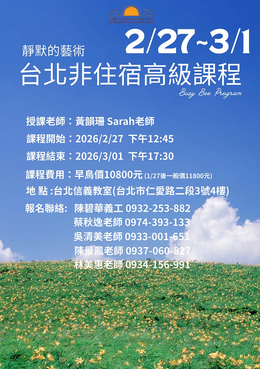 特價 上一項商品 高級課程@台北信義教室 2/27-3/1(非住宿)|韻珊老師 指導者|黃韻珊 日 期|2/27(五)~3/1(日) 時 間|五12:45-20:45;六07:00-21:00;日07:00-17:30 NT$11,800 原始價格:NT$11,800。NT$10,800目前價格:NT$10,800。 優惠方案 請選取一個選項開春特惠清除 高級課程@台北信義教室 2/27-3/1(非住宿)|韻珊老師 數量 加入購物車 貨號: 20260227-0301-ADV-黃韻珊 分類: 高級課程, 進階課程 標籤: 2月, 台北 描述 額外資訊 描述 靜默的藝術 228連假 高級課程 非住宿高級課程 高級課程@台北信義教室 2/27-3/1 🧘♀️課程指導:黃韻珊📅課程時間:2026/2/27(五) ~ 3/1(日) 2/27(五) 12:45 – 20:452/28(六) 07:00 – 21:003/01(日) 07:00 – 17:30📍課程地點:台北信義教室(近仁愛路、杭州南路口,捷運東門站2號出口)💬課程諮詢:陳碧華義工 0932-253-882蔡秋逸老師 0974-393-133吳清美老師 0933-001-651陳景鳳老師 0937-060-827林美惠老師 0934-156-991 💰課程費用:(非住宿)🕊️早鳥優惠至1/27截止原價 $11,800;早鳥價 $10,800 📚 報名課程:免登入 / 免註冊直接選課 → 加入購物車 → 結帳 → 綠界付款(新用戶系統會自動建立帳號)👤 查詢購買紀錄/我的課程:請使用帳號密碼或 Google 登入查看🚫 一位報名者一個email,請勿用同一個email重複報名相同課程✍️ 代他人報名,請先登出網站:另於結帳表填上對方姓名+對方的Email,由系統自動為其建立帳號 瞭解更多 高級課程 額外資訊 優惠方案 開春特惠 Opens in a new window Share on Facebook Opens in a new window Mail This Product 相關商品 快速檢視 初階課程, 兒童萬歲營, 兒童/青少年 特價 快速檢視 228連假|快樂兒童營@豐原住宿課程 2/27-3/1|瑩瑩老師選擇規格 此產品有多種款式。 可在產品頁面選擇選項 快速檢視 高級課程, 進階課程 特價 快速檢視 高級課程@台北MAG教室 4/3-6(非住宿)|韻珊老師選擇規格 此產品有多種款式。 可在產品頁面選擇選項 快速檢視 高級課程, 進階課程 快速檢視 農曆新年高級課程@台北微風小棧 2/20-22(非住宿)|韻珊老師選擇規格 此產品有多種款式。 可在產品頁面選擇選項 快速檢視 永恆過程(前世今生), 進階課程 快速檢視 永恆過程(前世今生)@台北-盈毓老師加入購物車