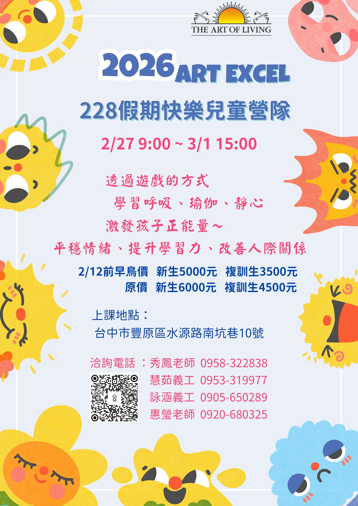 特價 上一項商品 下一項商品 228連假|快樂兒童營@豐原住宿課程 2/27-3/1|瑩瑩老師 指導者|惠瑩(瑩瑩老師) 日 期|2/27(五)~3/1(日) 時 間|(五)上午 09:00 – (日)12:00 NT$3,500 – NT$6,000價格範圍:NT$3,500 到 NT$6,000 新訓複訓 請選取一個選項新訓複訓 優惠方案 請選取一個選項早鳥價/每人原價/每人清除 228連假|快樂兒童營@豐原住宿課程 2/27-3/1|瑩瑩老師 數量 加入購物車 貨號: 20260227-0301-ART EXCEL-惠瑩 分類: 初階課程, 兒童萬歲營, 兒童/青少年 標籤: 2月, 台中 描述 額外資訊 描述 228連假 快樂兒童營 這是一個透過呼吸技術來幫助孩子提高學習專注力,減輕情緒壓力,進而達到身心健康的兒童營隊。在輕鬆、歡樂的遊戲氛圍中學習。每一個活動都精心設計,旨在培養孩子的創造力、團隊合作精神和自信心。透過這些多樣化的體驗,孩子不僅能學到新的技能,還能結交新朋友,收穫難忘的回憶。 Art Excel 豐原住宿課程 適合課程對象:8-12歲 透過遊戲的方式 學習呼吸・瑜珈・靜心 激發孩子正能量 平穩情緒 提升學習力 改善人際關係 牽手深呼吸,親子小旅行 快樂課程(大人班) 放鬆壓力 安定身心 提升知覺 大人課程 報名連結 快樂課程(兒童班) 遊戲中學習呼吸 平穩情緒 提升學習力 適合對象:8-12歲 228連假|快樂兒童營@豐原住宿課程 2/27-3/1 🧘♀️課程指導:惠瑩(瑩瑩老師)📅課程時間:2026/2/27(五)~3/1(日)2/27(五)上午 09:00 – 3/1(日)12:00📍課程地點:台中市豐原區水源路南坑巷10號(天元樓)💬課程諮詢:秀鳳老師 0958-322-838慧茹義工 0953-31-9977詠涵義工 0905-650-289惠瑩老師 0920-680-325 💰課程費用:(8-12歲)🕊️早鳥優惠至2/12截止🔴費用含小朋友三天食宿新生 $6,000;早鳥價 $5,000複訓 $4,500;早鳥價 $3,500 📚 報名課程:免登入 / 免註冊直接選課 → 加入購物車 → 結帳 → 綠界付款(新用戶系統將自動建立帳號)👤 查詢購買紀錄/我的課程:請使用帳號密碼或 Google 登入查看🚫 一位報名者一個帳號,請勿使用同一個email重複報名相同的課程✍️ 幫子女報名:請先登出自己的帳號,於結帳表填上子女姓名+子女的Email,由系統為其建立帳號報名 瞭解更多 淨化呼吸的好處 額外資訊 新訓複訓 新訓, 複訓 優惠方案 早鳥價/每人, 原價/每人 Opens in a new window Share on Facebook Opens in a new window Mail This Product 相關商品 快速檢視 初階課程, 自然三摩地心法, 靜心 特價 快速檢視 自然三摩地靜心@台北MAG教室 1/24-26|Leo.維達 老師選擇規格 此產品有多種款式。 可在產品頁面選擇選項 快速檢視 初階課程, 兒童萬歲營, 兒童/青少年 特價 快速檢視 寒假|兒童課程@汐止 2/10-13|Fiona 老師選擇規格 此產品有多種款式。 可在產品頁面選擇選項 快速檢視 初階課程, 自然三摩地心法, 靜心 特價 快速檢視 自然三摩地靜心一對一@新店 1/7-23 三時段任選|吳素英 老師選擇規格 此產品有多種款式。 可在產品頁面選擇選項 快速檢視 初階課程, 快樂課程, 淨化呼吸 特價 快速檢視 228連假快樂課程@豐原住宿 2/27-3/1|阿俊 老師選擇規格 此產品有多種款式。 可在產品頁面選擇選項