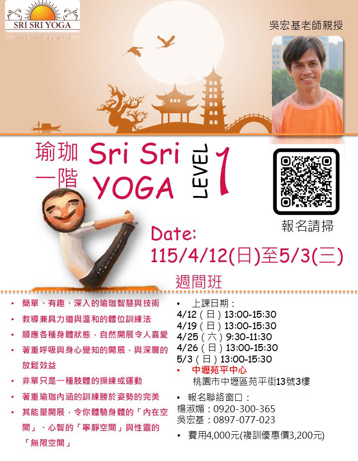 特價 上一項商品 下一項商品 詩麗詩麗瑜珈一階@中壢中心|吳宏基 老師 指導者|吳宏基 日 期|4/12(日)~5/3(日) 時 間|週間班五堂課:4/12.19.25.26.5/3 NT$3,200 – NT$4,000價格範圍:NT$3,200 到 NT$4,000 新訓複訓 請選取一個選項新訓複訓清除 詩麗詩麗瑜珈一階@中壢中心|吳宏基 老師 數量 加入購物車 貨號: 20260412-0513-srisriyoga-吳宏基 分類: 初階課程, 詩麗詩麗瑜珈一階, 瑜珈 標籤: 4月, 5月, 中壢 描述 額外資訊 描述 Sri Sri Yoga 瑜珈一階 簡單・有趣・深入的瑜珈智慧與技術 詩麗詩麗瑜珈一階@中壢中心 🧘♀️課程指導:吳宏基📅課程時間:2026/4/12(日)~5/3(日)週間班,共計5堂課:4/12(日)13:00-15:304/19(日)13:00-15:304/25(六)09:30-11:304/26(日)13:00-15:305/3(日)13:00-15:30📍課程地點:中壢中心(近健行科大) 💰課程費用:新訓 4,000元複訓 3,200元💬課程諮詢:淑媚老師 0920-300-365宏碁老師 0987-077-023 ⚠️報名注意事項:🔓 免登入/免註冊:直接選課→加入購物車→結帳→綠界付款🚫 一個email代表一位報名者,請勿重複報名相同課程📝 幫他人報名,請先登出網站。另於結帳表填上對方的姓名/對方的Email,由系統為其建立帳號報名。 查看更多 課程 額外資訊 新訓複訓 新訓, 複訓 Opens in a new window Share on Facebook Opens in a new window Mail This Product 相關商品 快速檢視 初階課程, 快樂課程, 淨化呼吸 特價 快速檢視 快樂課程@桃園龍潭 3/29-31|宏基.淑媚 老師選擇規格 此產品有多種款式。 可在產品頁面選擇選項 快速檢視 初階課程, 自然三摩地心法, 靜心 快速檢視 自選日期-自然三摩地靜心@台北大安區(平日.晚上.假日任選)|月芳老師加入購物車 快速檢視 初階課程, 快樂課程, 淨化呼吸 特價 快速檢視 勞動節連假快樂課程@台中 5/1-3|旭圻.千桓.寶如 老師選擇規格 此產品有多種款式。 可在產品頁面選擇選項 快速檢視 初階課程, 深度睡眠與舒緩焦慮, 深層睡眠 特價 快速檢視 2026第一季:深度睡眠與舒緩焦慮課程@線上5梯次擇一|清美.如憶.YOTI 老師選擇規格 此產品有多種款式。 可在產品頁面選擇選項