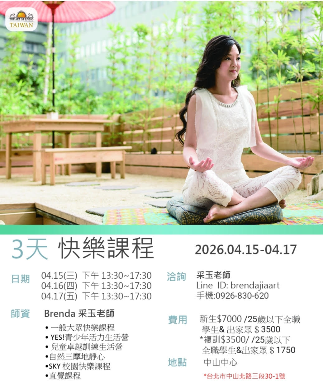 特價 上一項商品 下一項商品 快樂課程@台北中山中心 4/15-17|采玉老師 指導者|王采玉Brenda 日 期|4/15(三)~4/17(五) 時 間|週三四五下午13:30-17:30 NT$1,750 – NT$7,000價格範圍:NT$1,750 到 NT$7,000 新訓複訓 請選取一個選項新訓複訓 身份類別 請選取一個選項一般大眾全職學生(18–25歲) / 出家眾清除 快樂課程@台北中山中心 4/15-17|采玉老師 數量 加入購物車 貨號: 20260415-17-SKY-王采玉 分類: 初階課程, 快樂課程, 淨化呼吸 標籤: 4月, 台北 描述 額外資訊 描述 🧘♀️課程指導:王采玉Brenda📅課程時間:2026/4/15(三)~4/17(五)週三四五下午13:30-17:30📍課程地點:台北中山中心台北市中山北路三段30號-1(後棟)(民權西路站9、10號出口,步行約8分鐘) 💬課程諮詢:采玉老師 0926-830-620Line ID:brendajiaart 💰課程費用:身份類別初訓複訓一般大眾7,000元3,500元全職學生 (18–25歲)出家眾3,500元1,750元 ⚠️報名注意事項:🔓 免登入/免註冊:直接選課→加入購物車→結帳→綠界付款🚫 一個email代表一位報名者,請勿重複報名相同課程📝 幫他人報名,請先登出網站。另於結帳表填上對方的姓名/對方的Email,由系統為其建立帳號報名。 瞭解更多 淨化呼吸的好處 額外資訊 新訓複訓 新訓, 複訓 身份類別 一般大眾, 全職學生(18–25歲) / 出家眾 Opens in a new window Share on Facebook Opens in a new window Mail This Product 相關商品 快速檢視 初階課程, 快樂課程, 淨化呼吸 特價 快速檢視 快樂課程@台北微風小棧 3/10-12|Leo.惠玲 老師選擇規格 此產品有多種款式。 可在產品頁面選擇選項 快速檢視 初階課程, 快樂課程, 淨化呼吸 特價 快速檢視 快樂課程@台北微風小棧 3/20-22|淑敏老師選擇規格 此產品有多種款式。 可在產品頁面選擇選項 快速檢視 初階課程, 快樂課程, 淨化呼吸 特價 快速檢視 快樂課程@宜蘭礁溪 6/12-14|阿俊.Luca 老師選擇規格 此產品有多種款式。 可在產品頁面選擇選項 快速檢視 初階課程, 快樂課程, 淨化呼吸 特價 快速檢視 快樂課程@桃園龍潭 3/29-31|宏基.淑媚 老師選擇規格 此產品有多種款式。 可在產品頁面選擇選項