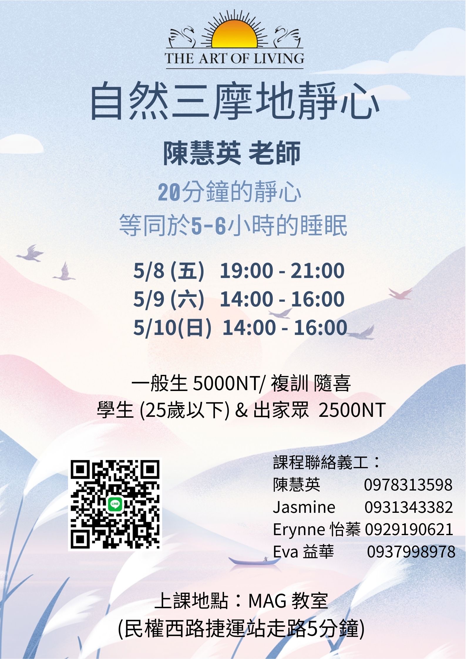特價 上一項商品 下一項商品 自然三摩地靜心@台北MAG教室 5/8-10|陳慧英老師 指導者|陳慧英 日 期|5/8(五)~5/10(日) 時 間|週五19:00-21:00;六日14:00-16:00 NT$2,500 – NT$5,000價格範圍:NT$2,500 到 NT$5,000 身份類別 請選取一個選項一般大眾全職學生(16–25歲) / 出家眾清除 自然三摩地靜心@台北MAG教室 5/8-10|陳慧英老師 數量 加入購物車 貨號: 20260508-10-SSM-陳慧英 分類: 初階課程, 自然三摩地心法, 靜心 標籤: 5月, 台北 描述 額外資訊 描述 20分鐘的靜心 等同5-6小時的睡眠能量 🧘♀️課程指導:陳慧英📅課程時間:2026/5/8(五)~5/10(日)週五 晚上 7:00 – 9:00六日 下午 2:00 – 4:00📍課程地點:台北MAG教室(捷運民權西路站步行約5分鐘)💬課程諮詢:慧英老師 0978-313-598Jasmine 0931-343-382Erynne 怡蓁 0929-190-621Eva 益華 0937-998-978 💰課程費用:身份類別初訓複訓一般大眾5,000元隨喜(現場繳交)(點此預約)全職學生(16–25歲)出家眾2,500元隨喜(現場繳交)(點此預約) ⚠️報名注意事項:🔓 免登入/免註冊:直接選課→加入購物車→結帳→綠界付款🚫 一個email代表一位報名者,請勿重複報名相同課程📝 幫他人報名,請先登出自己的帳戶。另於結帳表填上對方的姓名/對方的Email,由系統為其建立帳號報名。 瞭解更多 自然三摩地靜心的好處 額外資訊 身份類別 一般大眾, 全職學生(16–25歲) / 出家眾 Opens in a new window Share on Facebook Opens in a new window Mail This Product 相關商品 快速檢視 初階課程, 自然三摩地心法, 靜心 特價 快速檢視 自然三摩地靜心@台北中山中心 4/8-10、4/22-24 (三時段擇一)|淑芳老師選擇規格 此產品有多種款式。 可在產品頁面選擇選項 快速檢視 初階課程, 快樂課程, 淨化呼吸 特價 快速檢視 快樂課程@台中 5/8-10|旭圻.千桓.寶如 老師選擇規格 此產品有多種款式。 可在產品頁面選擇選項 快速檢視 初階課程, 自然三摩地心法, 靜心 快速檢視 自然三摩地靜心-預約制@台北大安區(平日.晚上.假日)|月芳老師加入購物車 快速檢視 初階課程, 快樂課程, 淨化呼吸 特價 快速檢視 快樂課程@中壢苑平中心 4/25-27|玟錡.燕青 老師選擇規格 此產品有多種款式。 可在產品頁面選擇選項